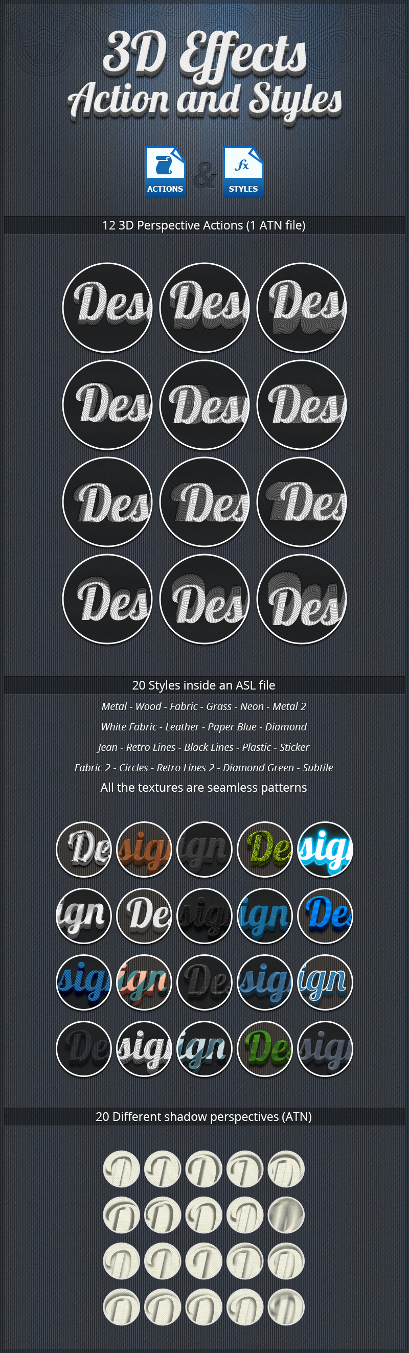 A set of amazing text effects and actions for Photoshop texts such as titles and logos text. Inside this set, you’ll find 12 perspective actions in ATN format, and 20 material styles in an ASL file. Some of the styles you’ll get are metal, wood, fabric, grass, neon, retro lines, diamond green, plastic, and more.