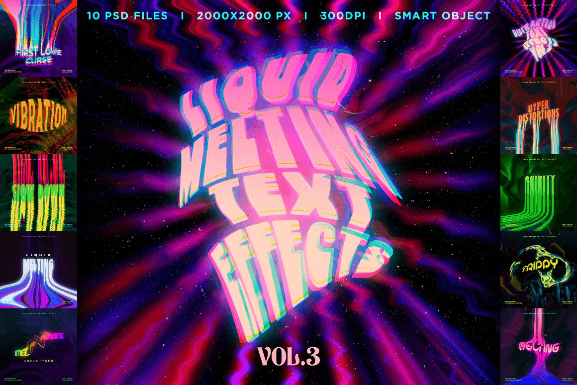 Check out this neat collection of Photoshop text templates featuring 30 unique editable PSD templates with distorted, glitched, psychedelic and melting liquid texts, with vibrant color palettes, highly editable layered files, and a large variety different effects that you can use to create awesome looking digital designs and prints.