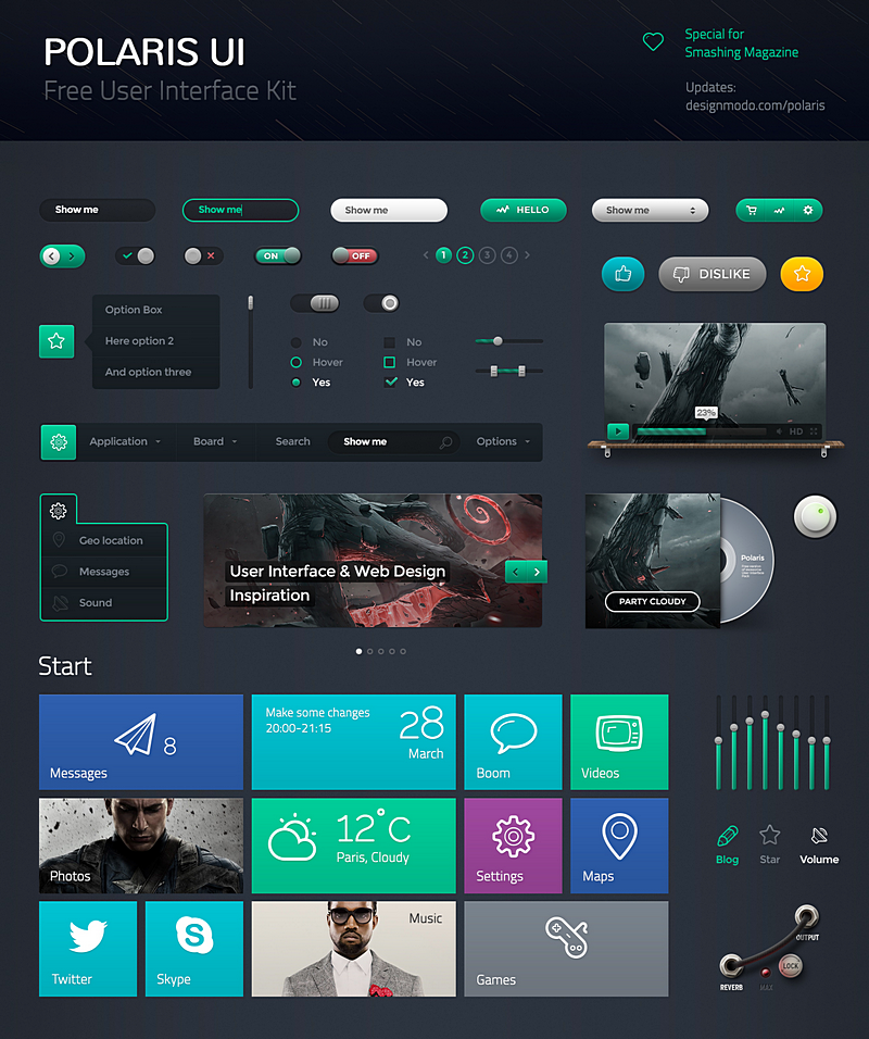 A beautiful set of colorful UI elements created by the Designmodo team for Smashing Magazine. The items draw inspiration from various sources, such as Microsoft’s Metro concept. You can increase and decrease size with no problem, thanks to the use of shape layers (vector elements).