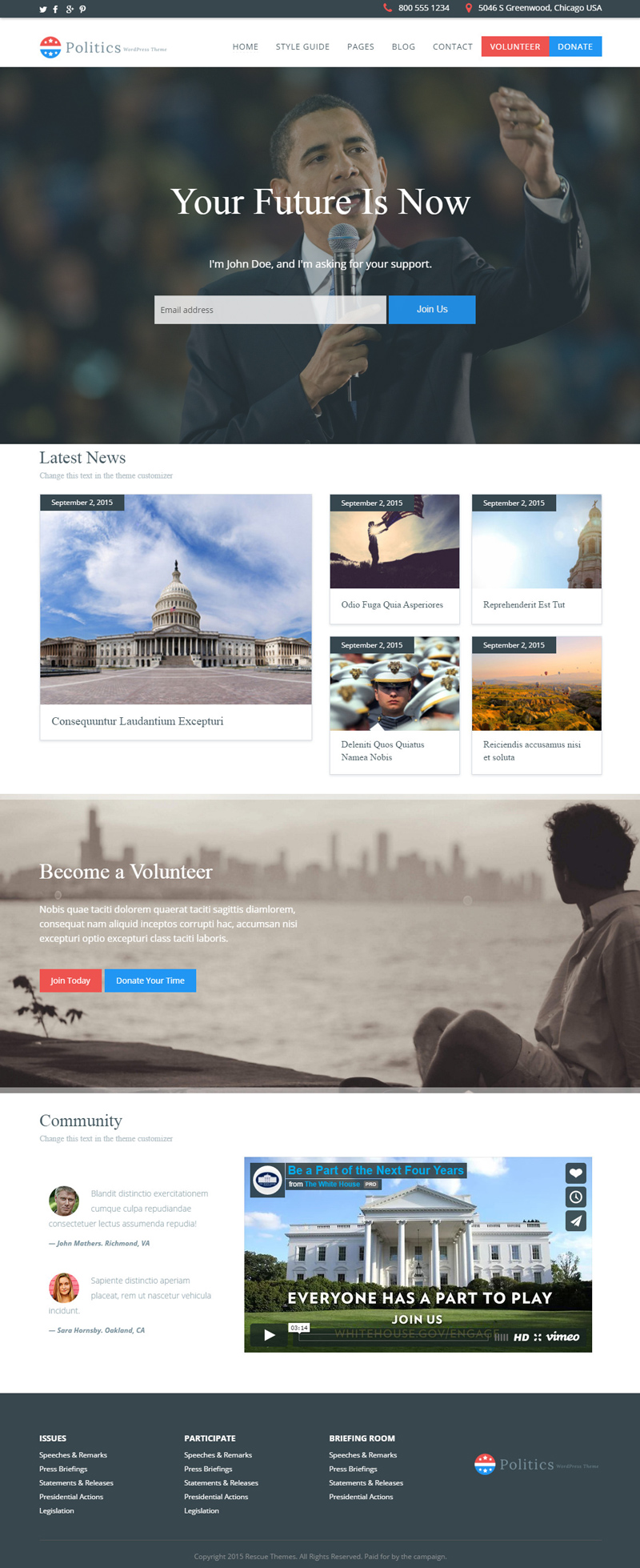 Politics is a multi-page WordPress theme developed for politic campaigns featuring a nice home page with a full-width header showcase, parallax effects, and nice secondary pages.