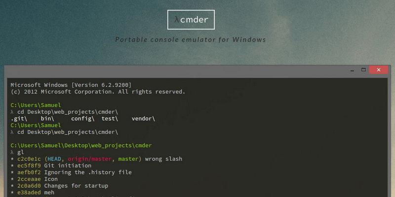 cmder is a portable console emulator for Windows. It has a Monokai color scheme and a custom prompt layout, and it’s a complete package that you can carry anywhere, in a USB drive or in the cloud, so you don’t lose your settings and overall progress. It was developed by Samuel Vasko.
