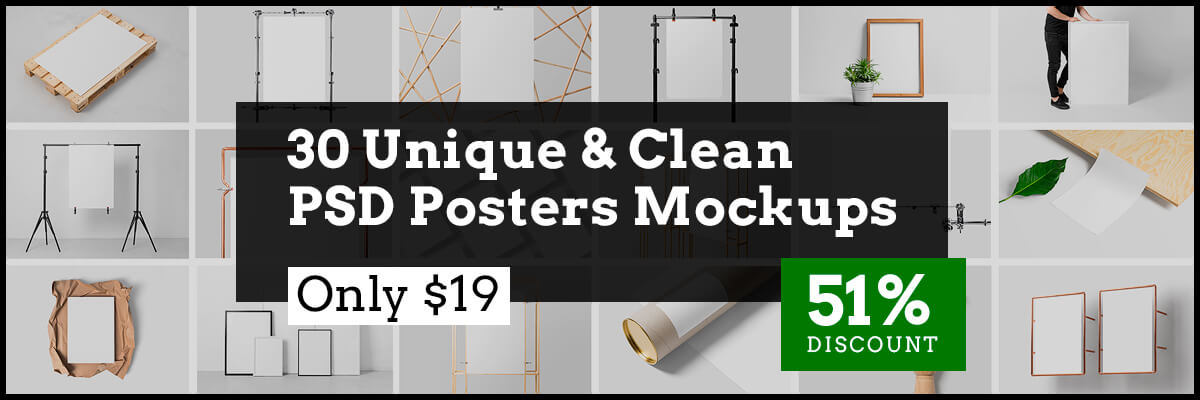 The new Mr.Mockup collection, intended to help creative professionals to showcase their work in the best way possible. Find 30 of the best unique, professional and clean PSD posters mockups for scene creation. Fully layered and well organized contents, including help files documentation in PDF. Change background color in a second or add your own background texture. super high resolution (6000 x 4000 px in 300 dpi), perfect for print and web. Normally price $39 USD, with our deal Only 19! (51% Off).