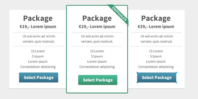 A pretty clean and flat pricing table. This is not a PSD file, but it is an editable PNG that you can modify in Fireworks. the colors used in this one are green and blue, with very light tones and a minimal style mixed with outlines for the borders. You can download and edit the resource freely.