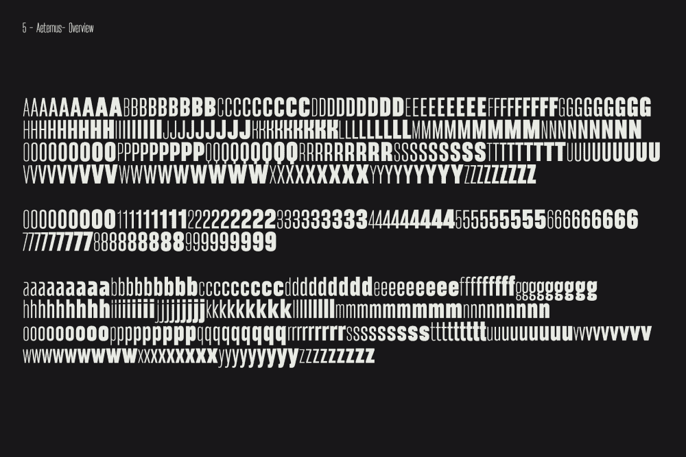 Aeternus is a geometric Sans Serif Variable typeface with matching italics that combines different heights and weights to provide versatility in any application context be it body-copy, titles/headings, or large display compositions.