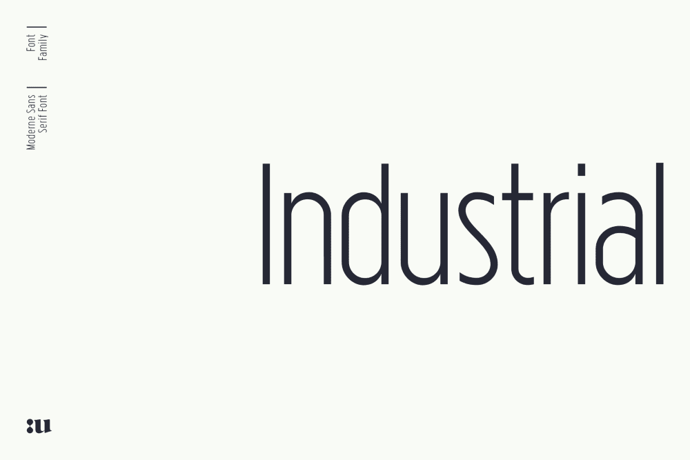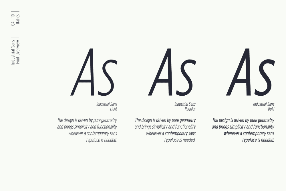 Industrial is a visual contemporary sans serif typeface composed of three weights plus their matching obliques.