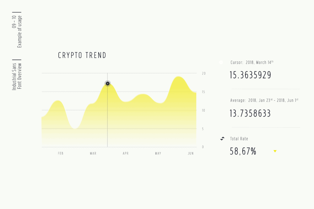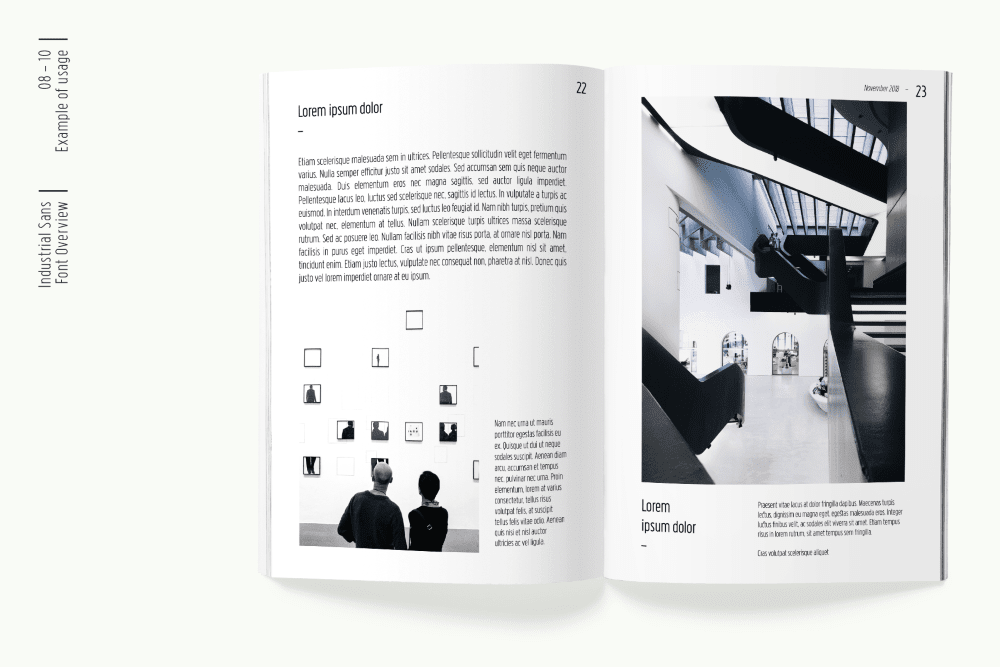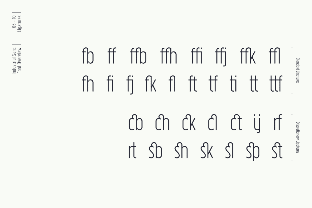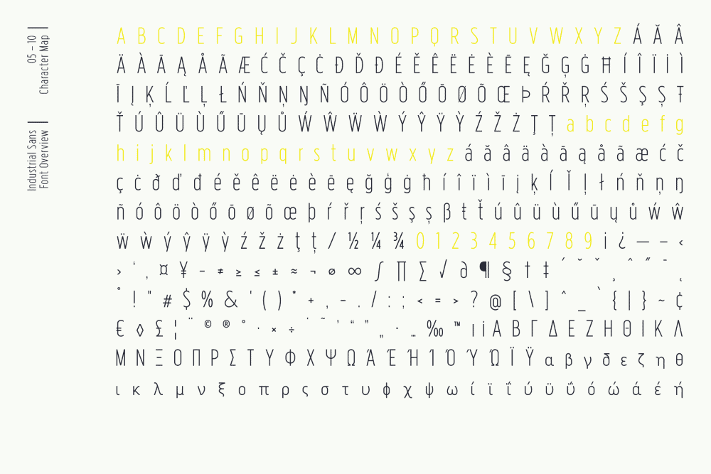 Industrial typeface includes over 450 characters with coverage for several languages using latin alphabet as well as the Greek alphabet. The font family provides advanced typographical support such as a significant number of neat standard and discretionary ligatures and broad support of OpenType features (OTF).