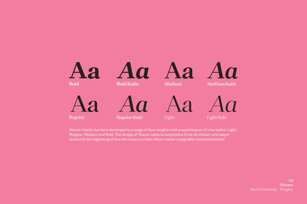 Developed in a range of four weights with a matching set of true italics, the design of Macaw takes its inspiration from the Italian newspaper market at the beginning of last the century, a time where roman typography was predominant.