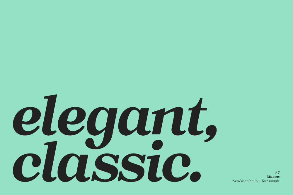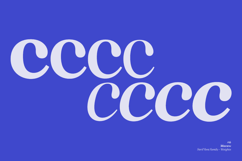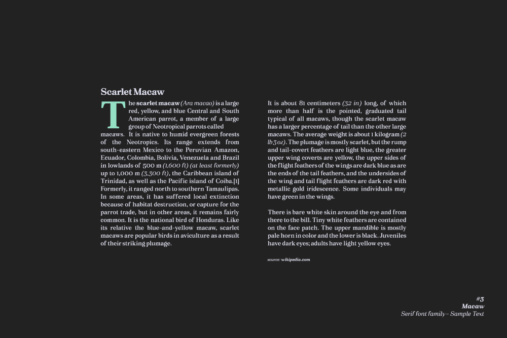 “Macaw” is a welcome addition to our library, a modern serif typeface with roots in classical typography. Its forms are sober and delicate in its lightest weights and as the width increases to the boldest, it unleashes a powerful and distinctive emphasis on your project.