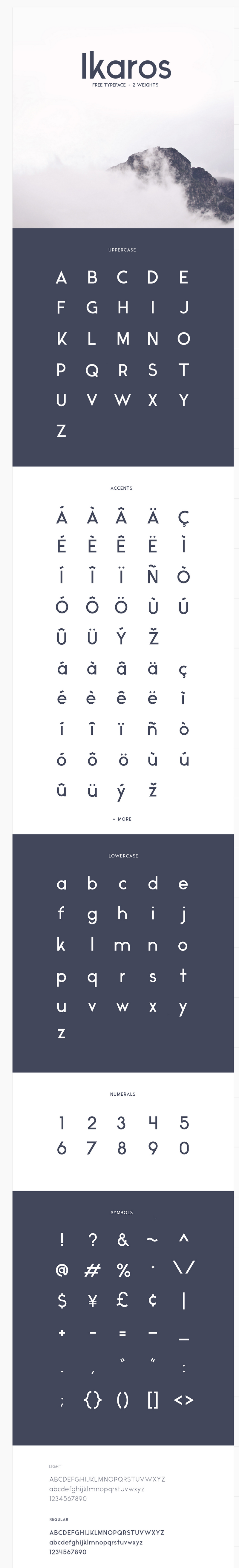 Ikaros is a professionally looking sans serif typeface, perfect for modern websites which want to keep an elegant appearance. Made by Matt Ellis. It has uppercase and lowercase characters, accents, numerals and additional symbols. A free font for personal and commercial projects.