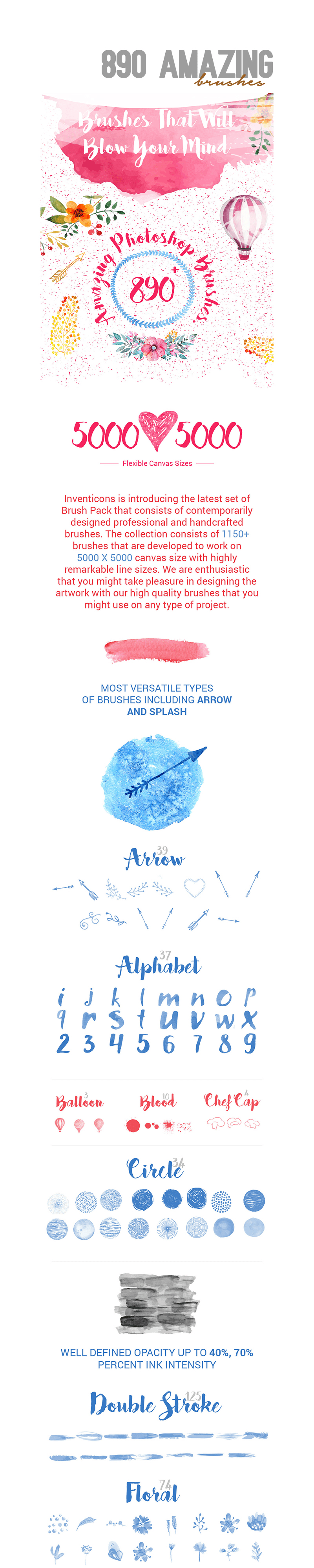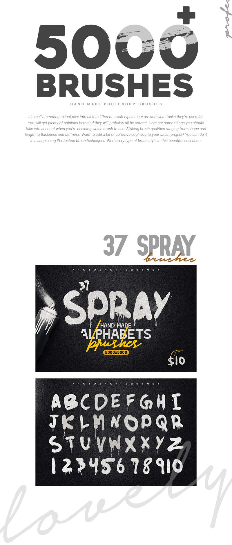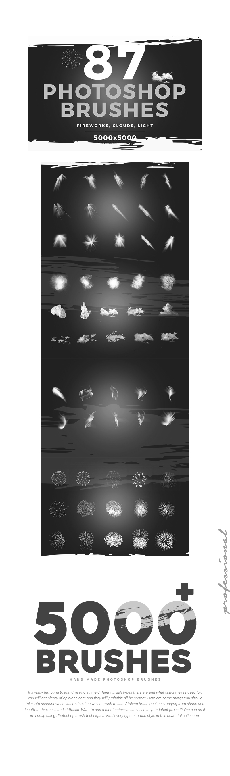 A massive collection of PS Brushes featuring over 5000 unique brushes in 16+ categories, including classic brush Strokes to shape brushes like Fireworks, Cloud Shapes, Smoke, Spray & many more!
