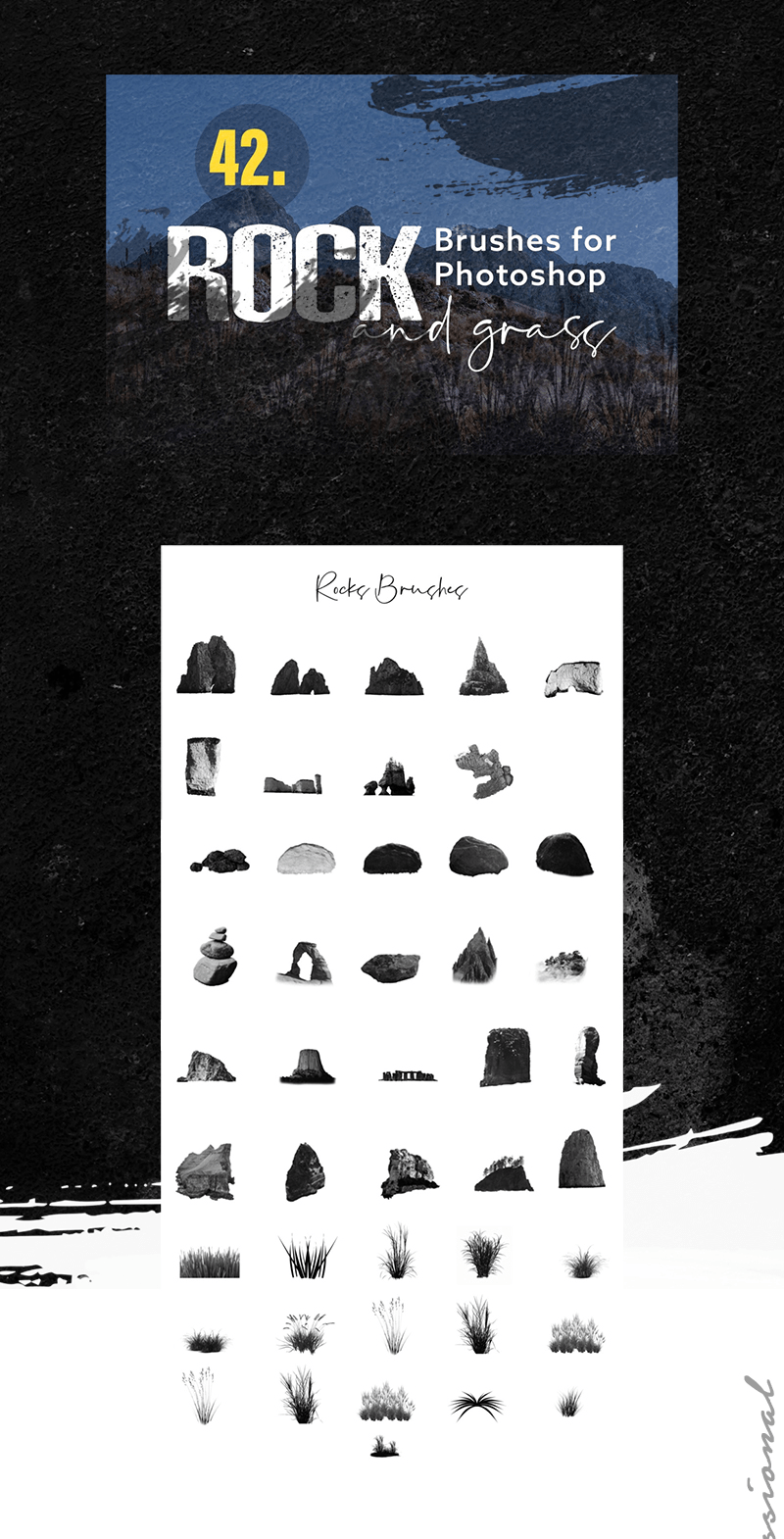 - Huge variety of shape brushes – grunge, charcoal, firework, spray, rock, gras, smoke & more