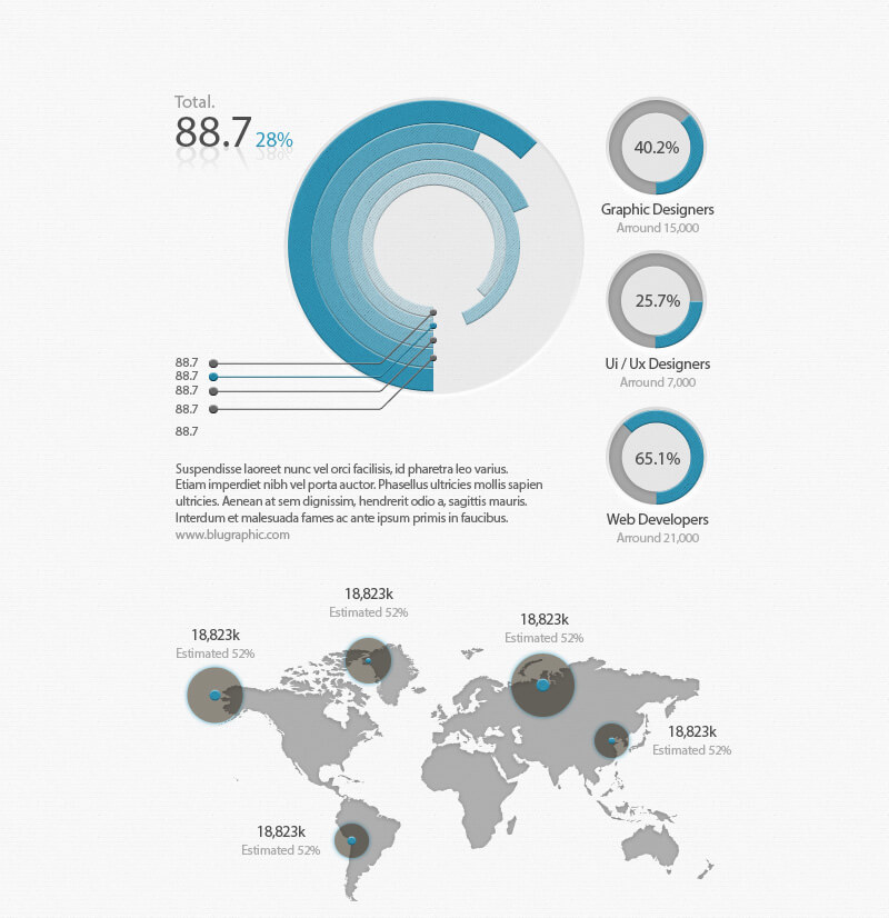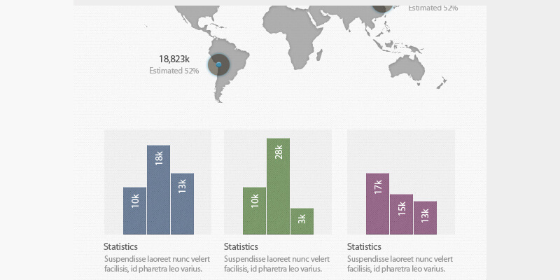 A free set of infographic elements in soft cold colors and subtle textures brings a fresh look to corporate-styled data visualization. This resource comes in the form of an editable PSD containing pie charts, bar charts, a world map and more. The drawback is that the layers are unorganised, no groups made at all.