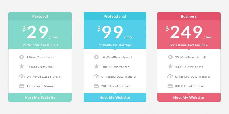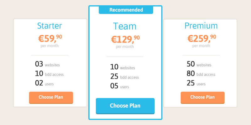 Pricing tables provided in PSD format. They combine multiple styles: Flat, minimalistic, glossy, etc. Ideal for introducing future customers to your products.