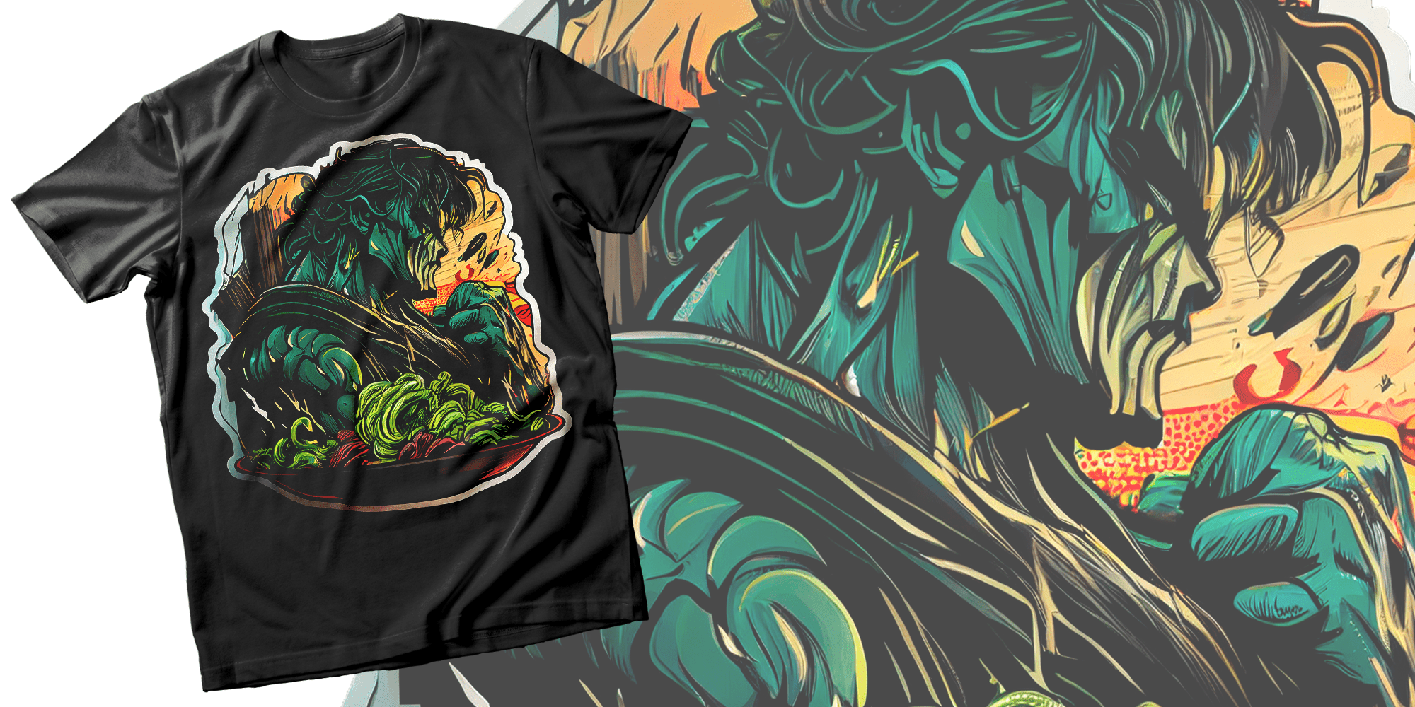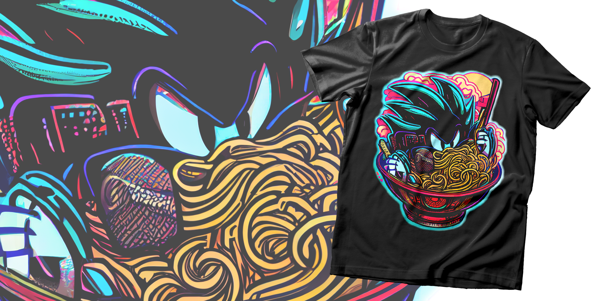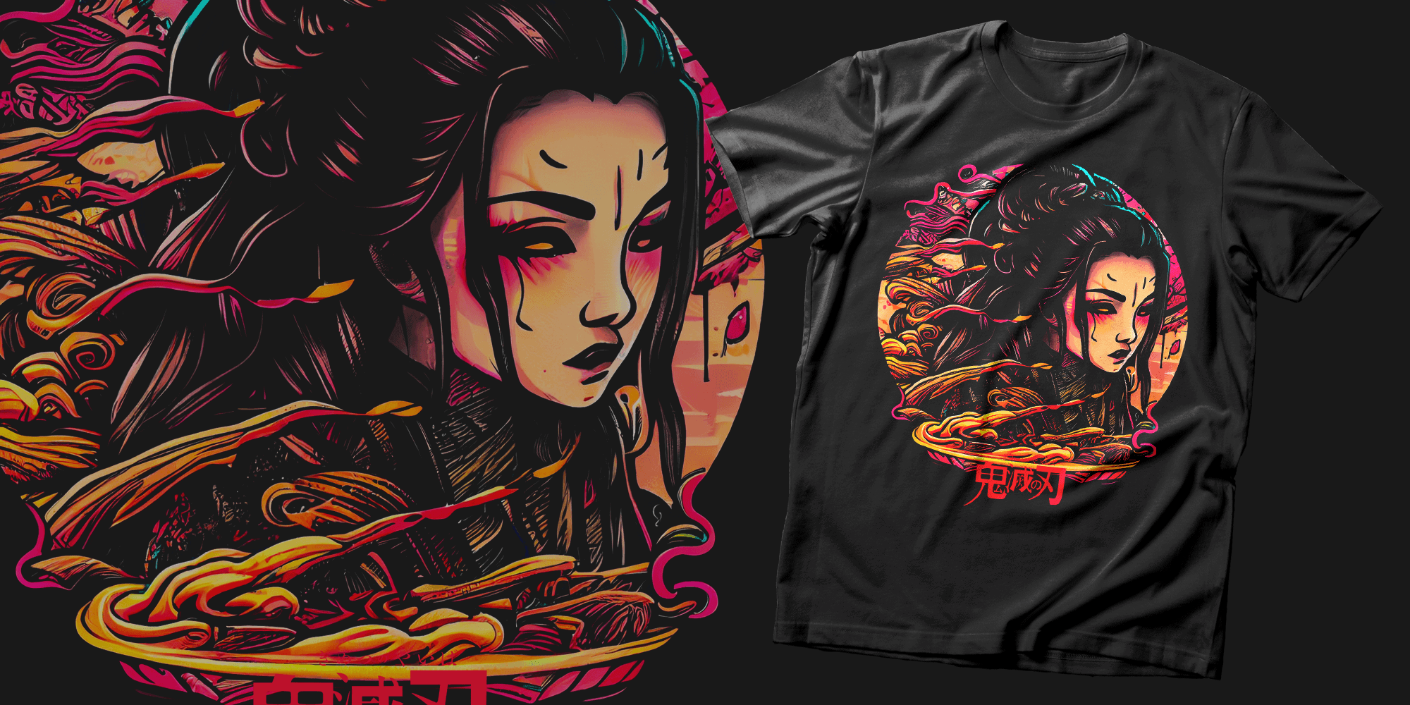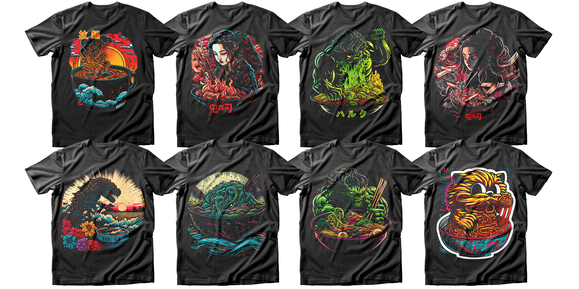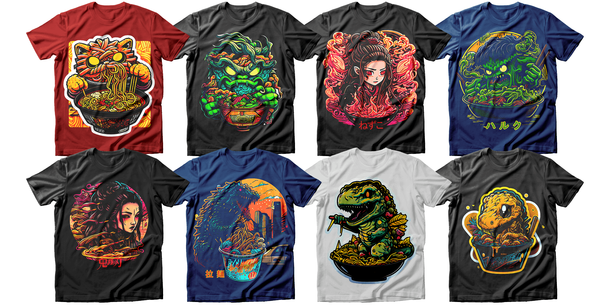 A brand new collection of Japanese t-shirt designs with 50 designs inspired by the anime style of illustration, featuring a variety of characters from popular anime shows as well as original artwork, all with a common Ramen theme across the whole bundle.