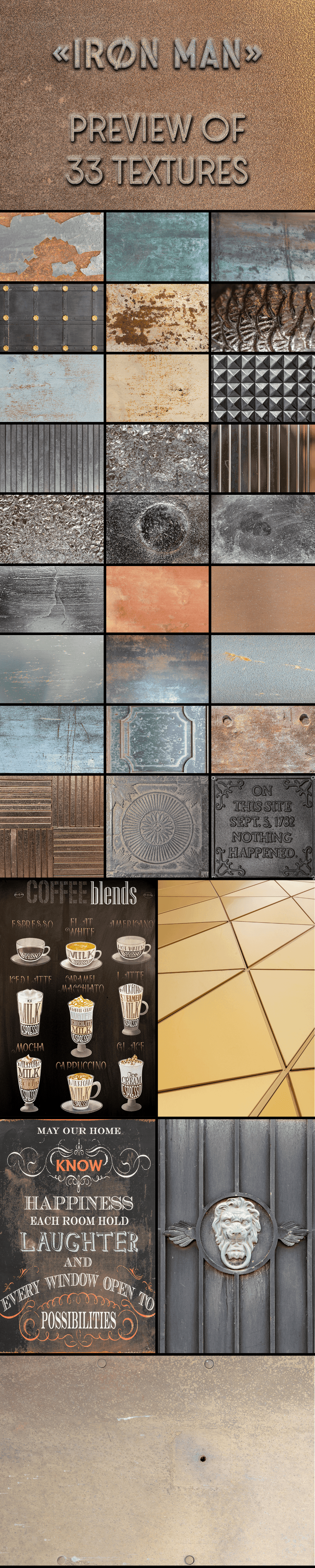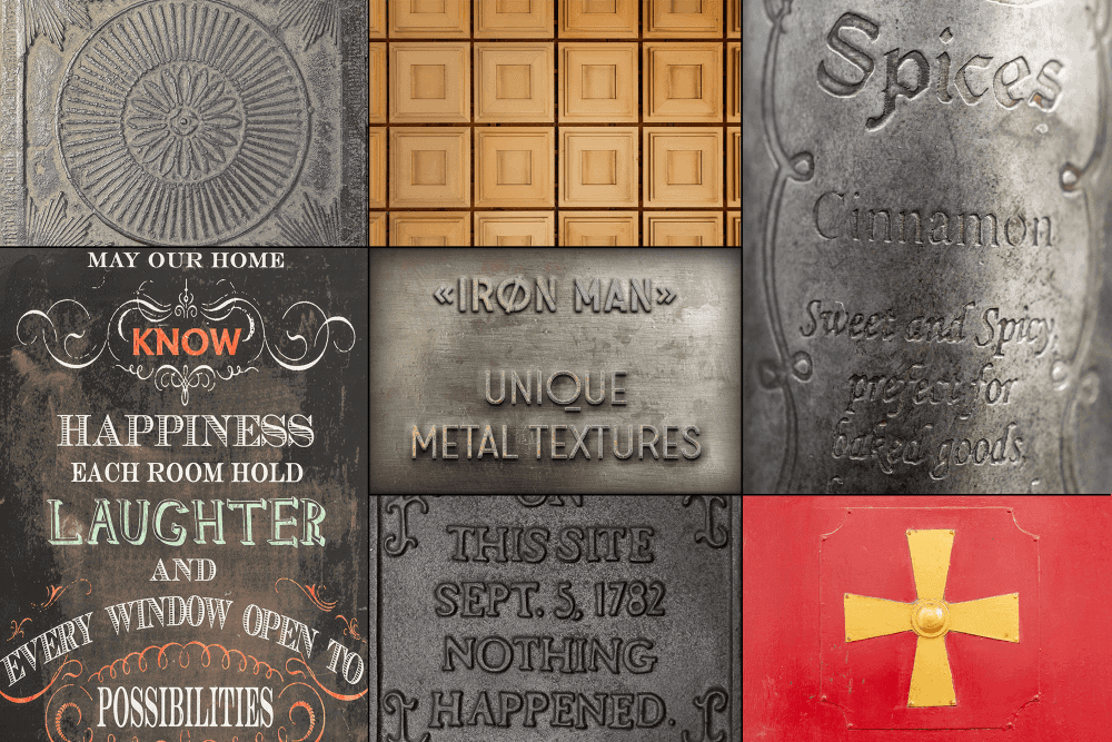 Every texture is delivered in 5K resolution TIFF files format, printable at 300dpi, and in the collection you will find materials with horizontal as well as vertical shots – everything from brick walls to vintage wooden tables, rusty iron, papyrus papers, steel chains, foils, roofing tiles and many other objects and materials