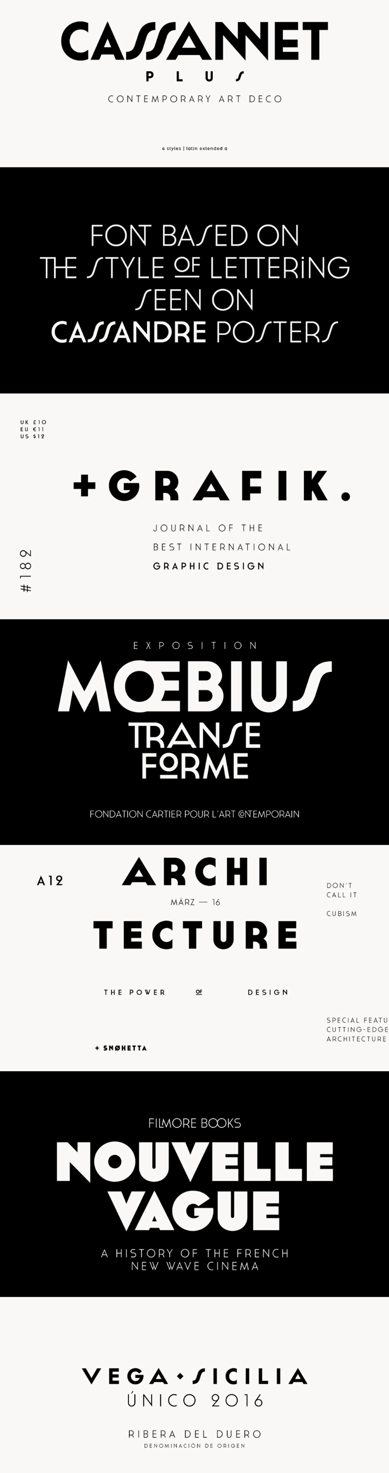A font inspired on the lettering style of Cassandre posters, with a touch of art deco. It works perfectly to help art pieces convey a message. It can be used in modern art, architecture, expositions, and more.