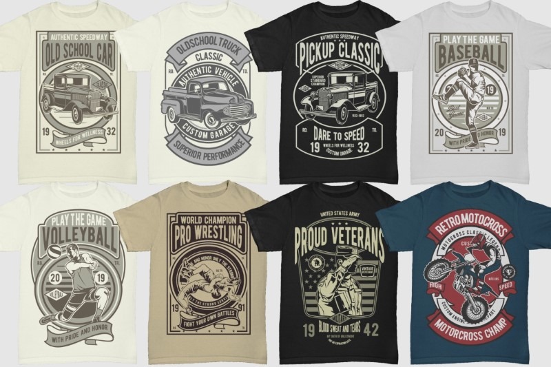 You will receive a collection that features several different themes drawn in a retro design style reminiscent of the different aesthetics popular during the decades of 1920s up to the 1980s such as hotrod vehicles, baseball players, boxing drawings, classic motorcycle & garage illustrations, astronauts, vespa motorcycles, weightlifting & many more