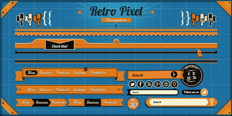 A huge and quite complete UI kit that features a more than 1000 elements of different sorts such as navigation, badges, boxes, bars, ribbons, sliders, calendars, and more, all of them fully crafted in retro-vintage style and customizable in 30 different colors, along with icons for social media and several others like home, contact, download, etc.