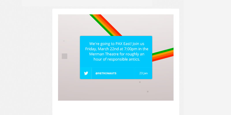 A Twitter widget created by Brandon Morreale as part of a bigger project called Retronauts. Its limited space works well for showing short pieces of info, focusing only on one tweet, the username and the date. Additionally, there’s a small Twitter button where we can link the user wherever we want him to go after (the full profile being the logical option).