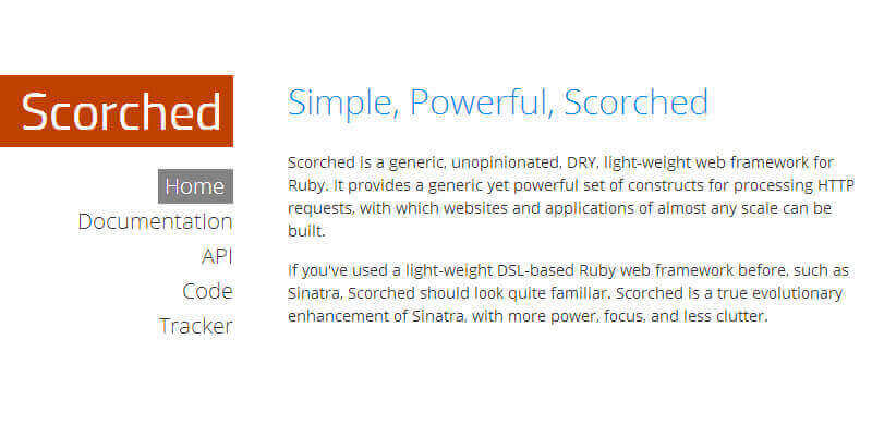Scorched is a generic, unopinionated, DRY, light weight web framework for Ruby. It provides a generic yet powerful set of constructs for processing HTTP requests; with it, websites and applications of almost any scale can be built.
