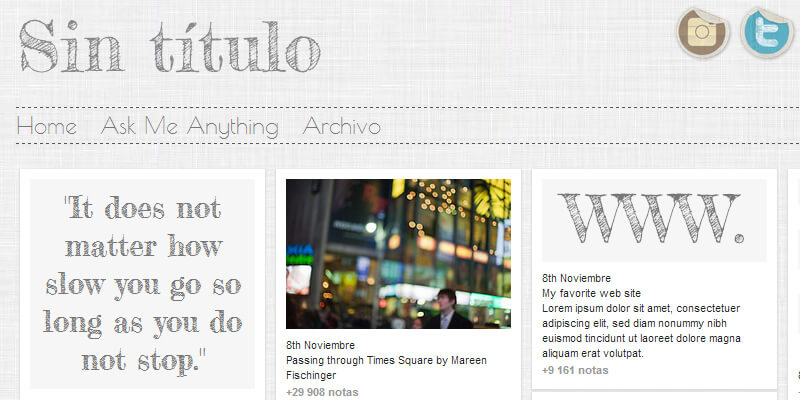 This is a Pinterest-like Tumblr theme suited for photographers, writers and artists in general who need to show their creations. The Scrapbook 2012 theme was inspired by the author’s fiancé’s love of Pinterest, Etsy and various other vintage/craft type sites, which he hopes it can be a platform for similar folks to showcase beautiful things from across the web.