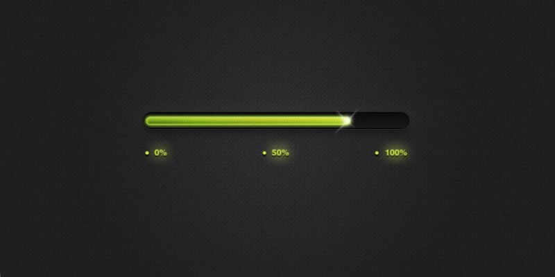 A glamorous progress bar styled with bright shining effects and a strong green color. The loading process is signaled with numbers at the 0, 50 and 100 per cent lines. A sober black background can be seen around the design. The original PSD is available in order to make changes.