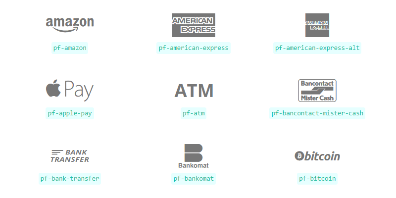 A complete set of payment icon fonts. It is a great way to add to an e-commerce website in order to show your users which payment methods can they use. The font has about 100 different icons and is licensed under the SIL OFL 1.1 and the CSS code is licensed under the MIT License.