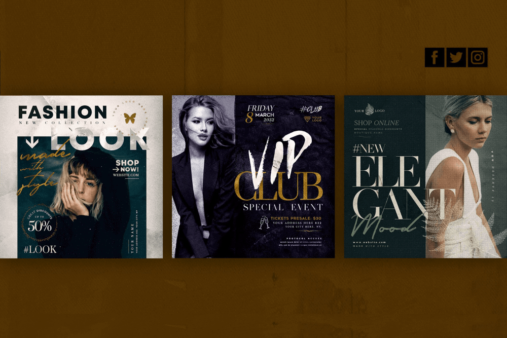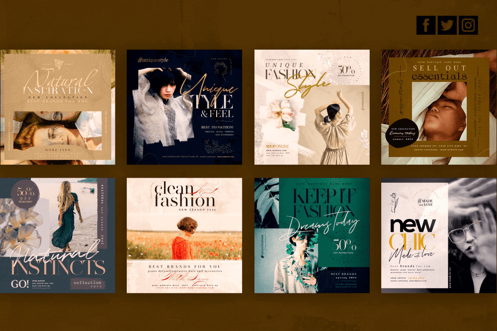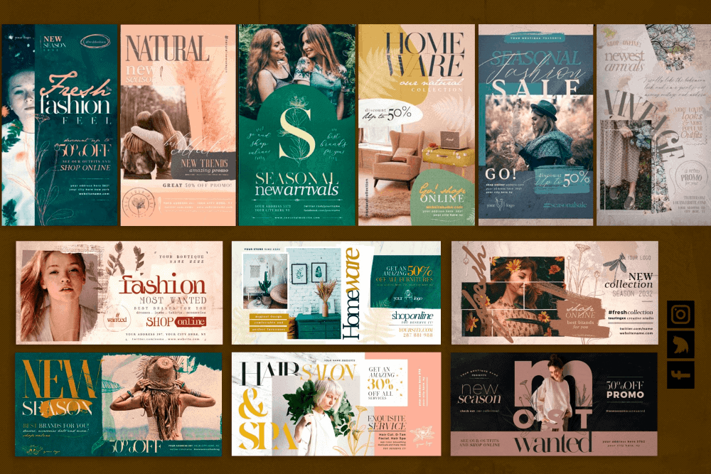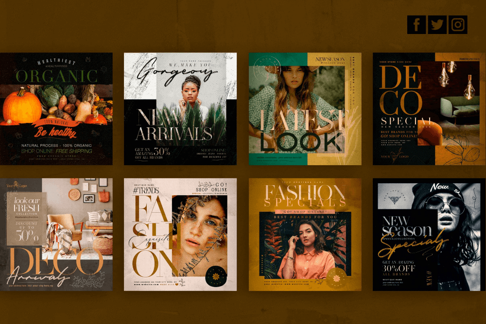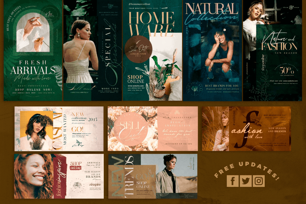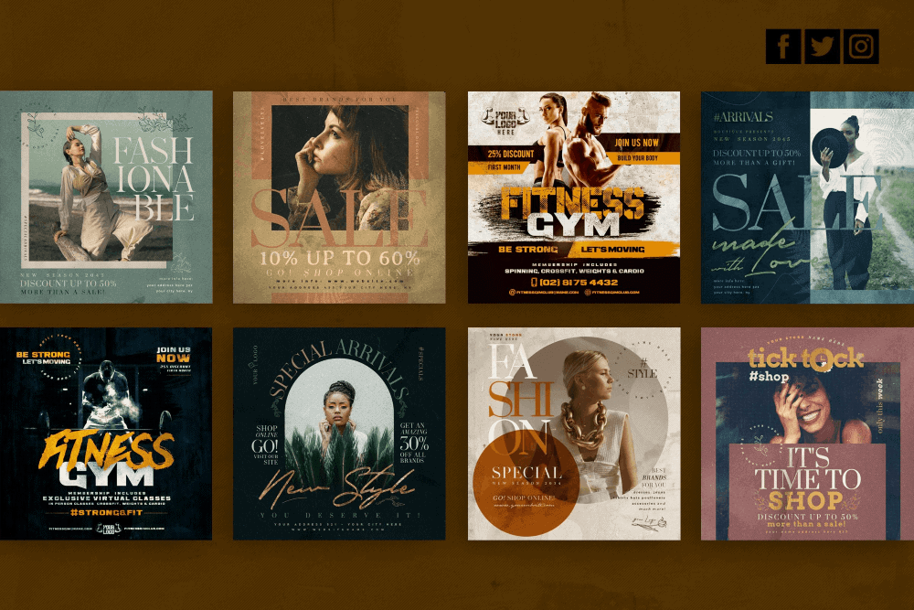 This package brings you a comprehensive collection of templates for your social media marketing across all major social platforms, with 49 templates for each category including Instagram post templates, Instagram Story templates, Facebook covers, Facebook post templates and Twitter post templates, for a total of 245 templates