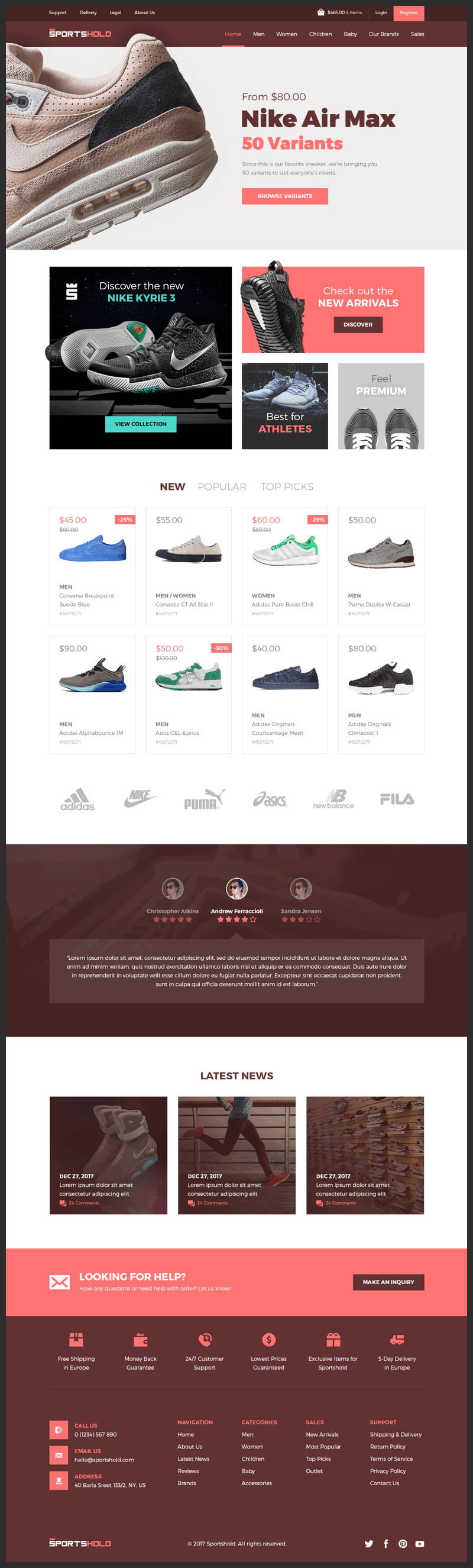 SportsHold is a nice looking landing page template created by Dribbble user Cosmin Negoita and released as a freebie in PSD format. It features an optimal layout for eCommerce related websites, with a nice Hero image and call to action button, a stylish image grid right under, as well as several spaces to showcase products.