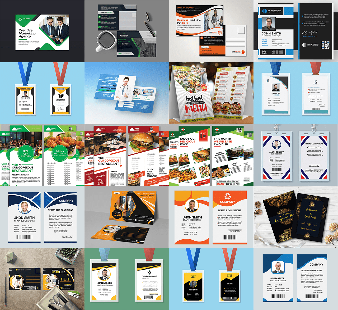 - Brochures, business cards, cards & invites, flyers, letterheads, logos, magazine