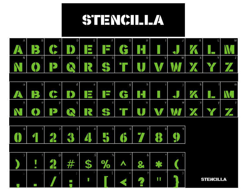 Stencilla is an all caps, simple stencil font best suited for plotting work. Includes accented letters, numbers and special characters.