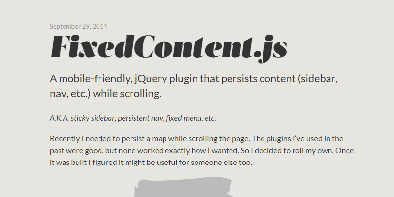FixedContent.js is a jQuery plugin that creates a persistent nav, sticky sidebar or fixed menu, among others. It is really useful if you need to feature content across your site, like a new product or a service. This was created as a personal project, but the author has released it for everyone to use. It was made by Jeremy Church and it is free to download.
