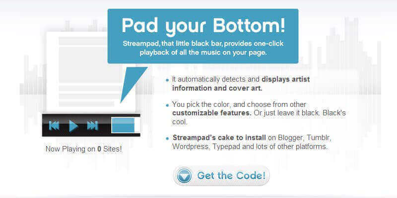 Steampad is a little bar you can add to the bottom of your website or blog to play music. Add it to Blogger, Tumblr, WordPress, Typepad and lots of other platforms.