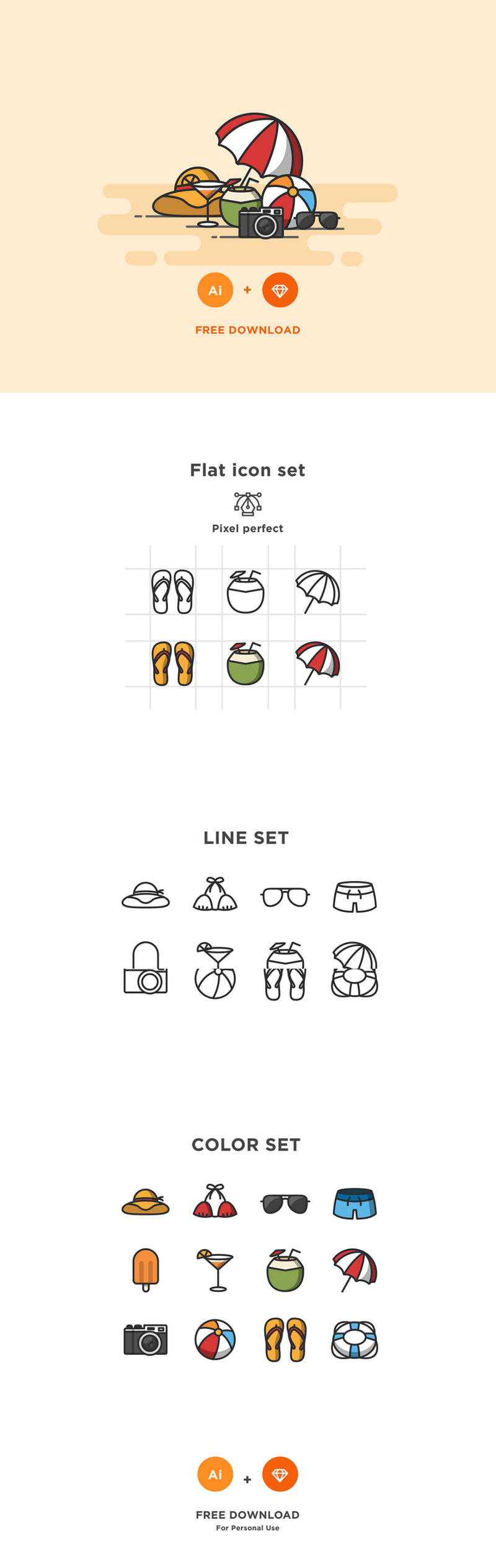 Free Outlined icons with a summer motif, the pack includes 12 unique icons in Line and Colored variations. The pack, created by Behance user Aom Am, is free for personal use only and is available in Ai and Sketch formats.