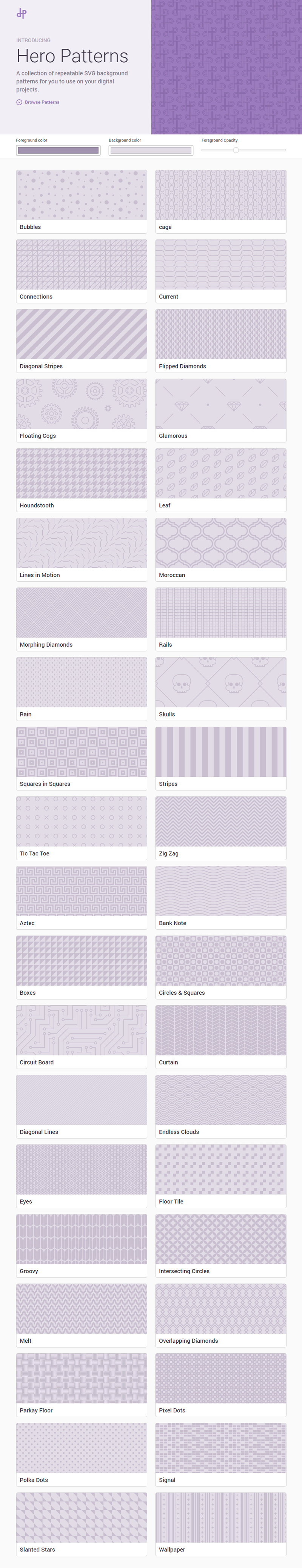 Hero Patterns is a collection of repeatable SVG background patterns for you to use on your digital projects. The background and foreground color and the opacity can be changed for the patterns.