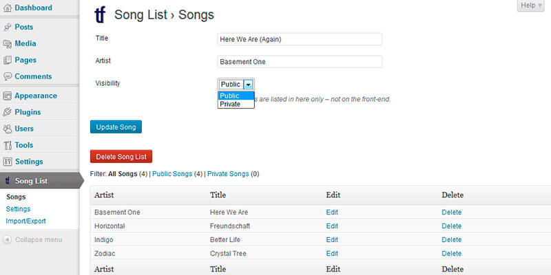 An very simple plugin that enables musicians and bands to organize songs into lists. Apart from managing additions, removals and order, the tool allows you to export and import songs from a CSV file, change styling and add custom settings.