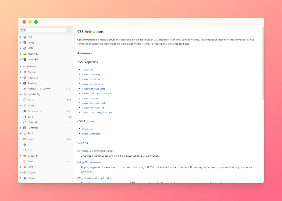DevDocs is essentially a library that combines multiple API documentations in an organized, searchable interface, super easy to navigate and comprehensive enough, with hundreds of API documentations currently available for you to research.