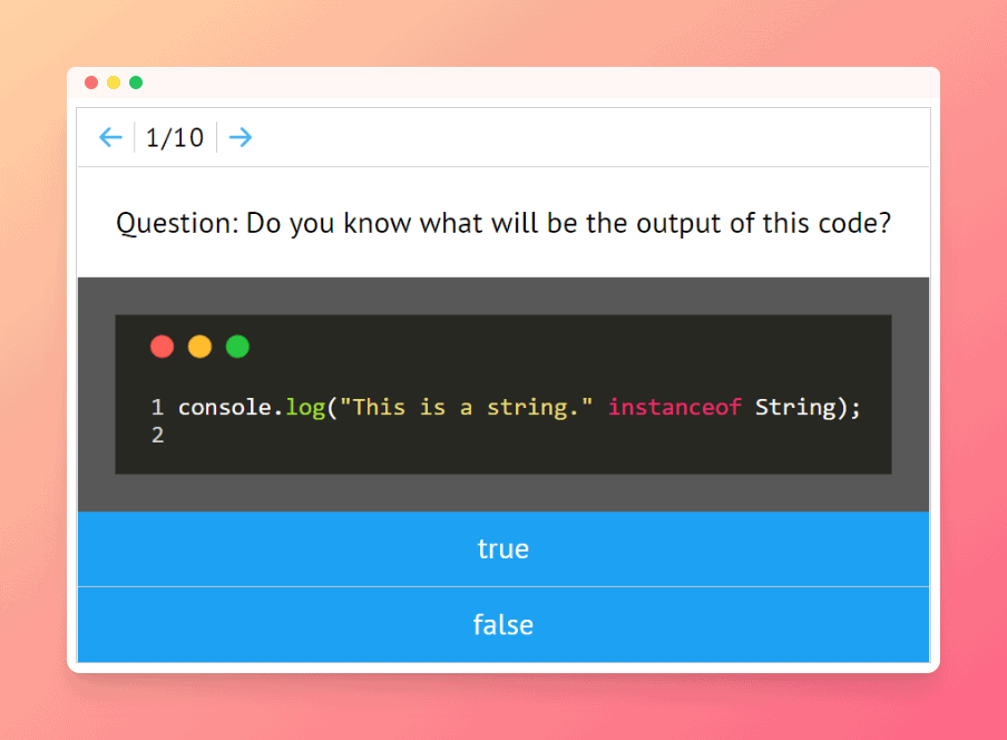 Javascript Quiz is a fun tool to check your JS knowledge while having fun! It displays Javascript snippets and asks questions about them to check whether or not you understand the code, and also provides detailed explanations for each one of the answers so you can improve your Javascript knowledge.