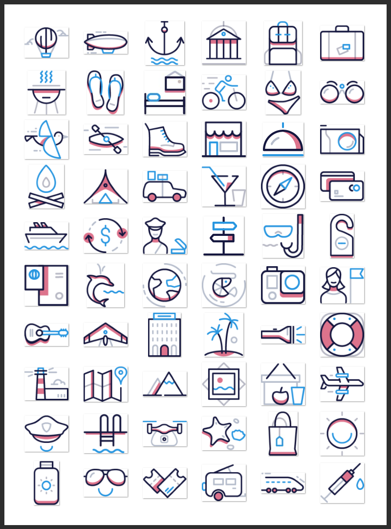 From the guys over at AgenteStudio, this great looking Line Icons Pack includes illustrations for transportation, equipment, activities and other topics reminiscent of summer vacation and travel. Released under a Creative Commons Attribution 4.0 International license