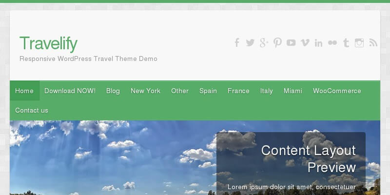 Travelify is a theme for WordPress blogs about traveling and adventures. It is a responsive theme, with retina support, theme options panel, featured posts slider, multiple layouts, plugins, WooCommerce integration, translations and theme documentation.