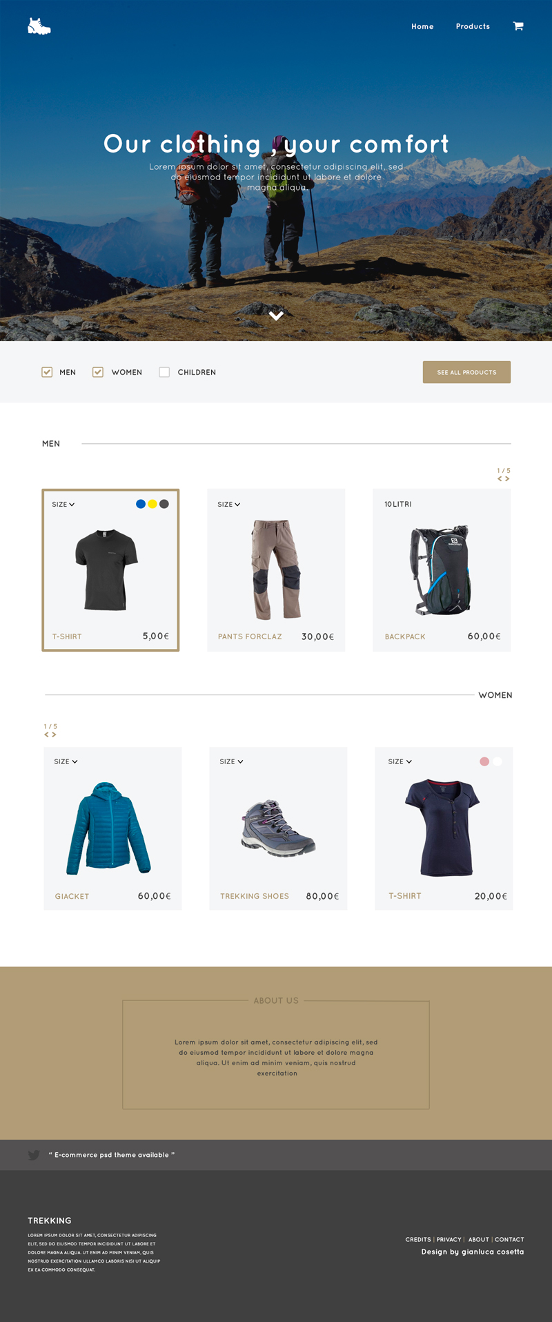 A beautiful and visually focused web template made in PSD format for travelling and trekking. It has a store approach, allowing you to use it in your own personal travelling or sports supplies business. The template has a simple top bar, a big featured image, a simple filter menu right below, products showcase, about us area and more. It was created by Gianluca Cosetta.