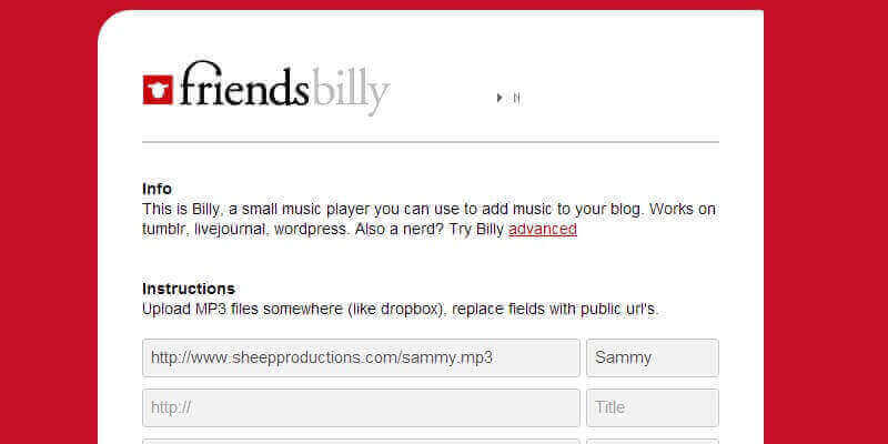 Billy is a music player that plays tracks stored in public URLs and can be embedded in environments such as WordPress, Tumblr and Livejournal through a shortcode.