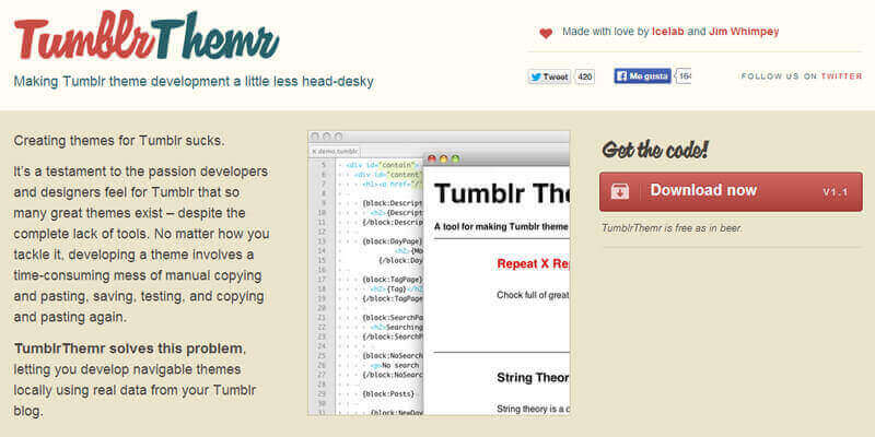 TumblrThemr solves the problem of developing a theme, which involves a time-consuming mess of manual copying and pasting, saving, and testing, letting you develop navigable themes locally using real data from your Tumblr blog.