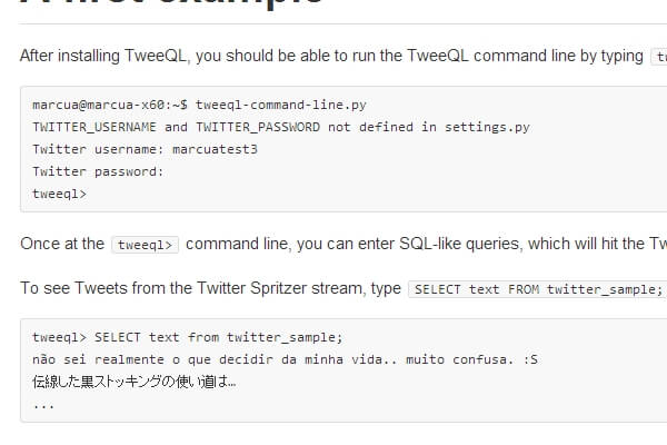 TweeQL makes interacting with the Twitter API as easy as SQL makes it to interact with relational data!For example, the TweeQL query SELECT brand(text) AS brand,