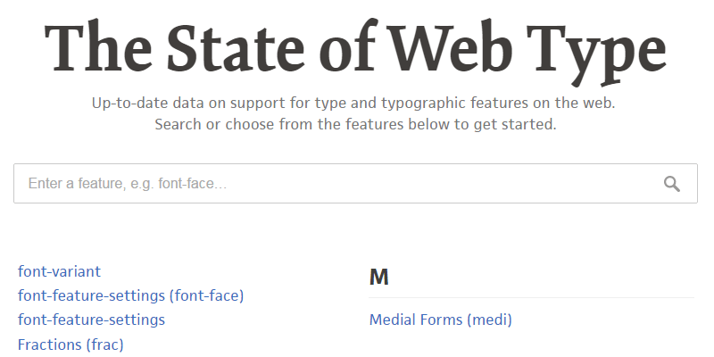 The State of Web Type is a compelling and useful online service that allows you to check the status of several features of web fonts. It includes status of ligatures, forms, swashes, spacing, denominators, and font loading, among many others.
