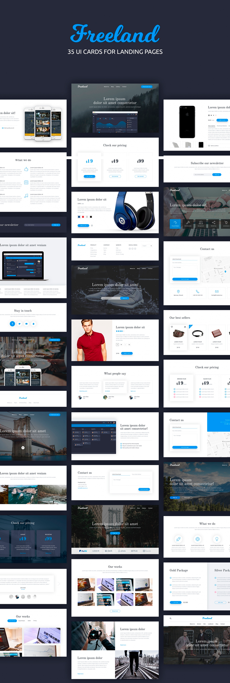 This is a UI kit for pages that includes 35 UI cards. Intended to be used on landing pages it has a minimalistic design and comes in a fully customizable PSD file.
