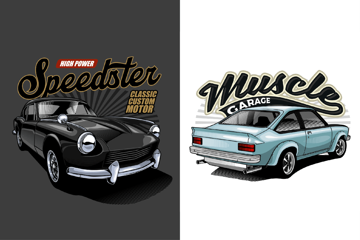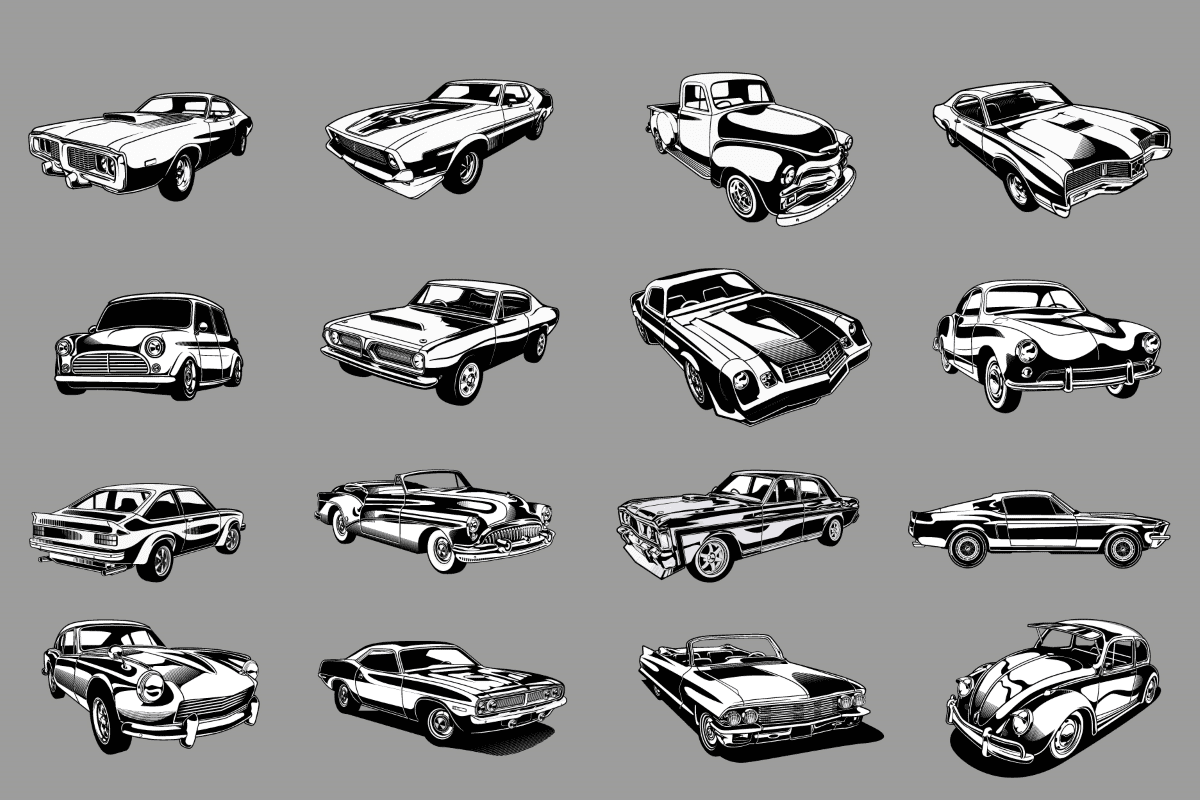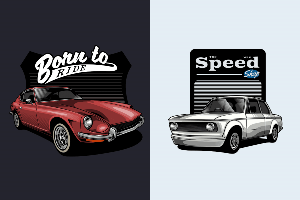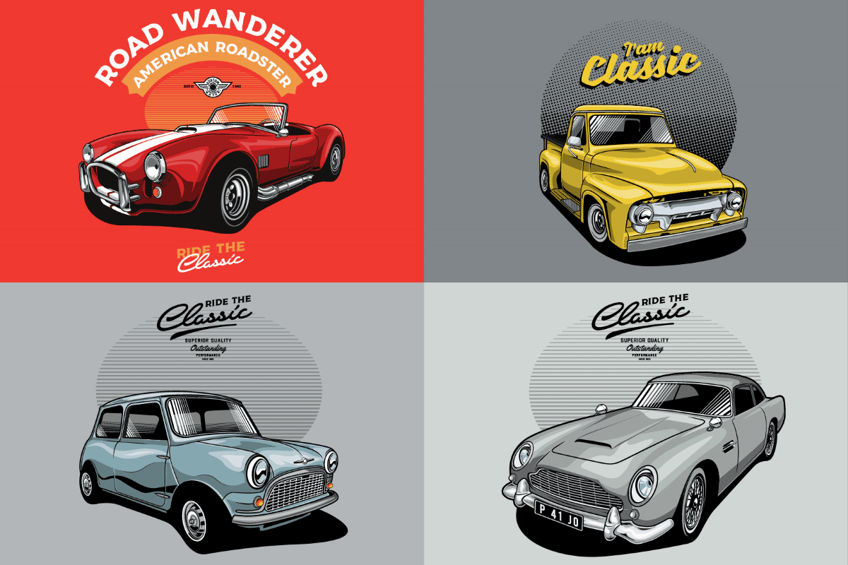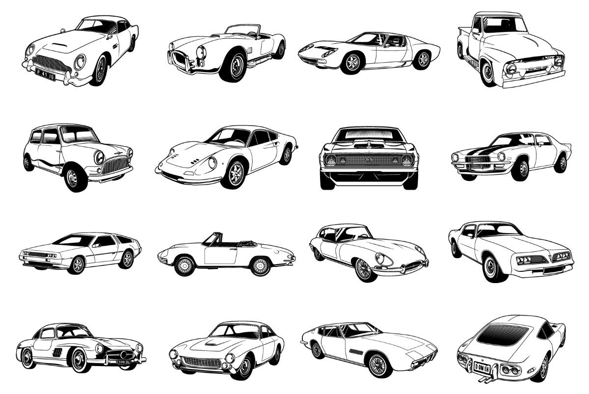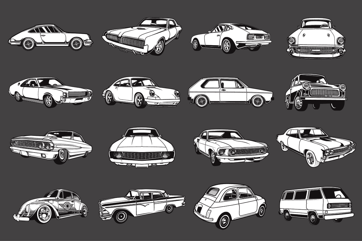 A big bundle of vector car illustrations with over 150 unique depictions of classic cars, american muscle cars, hotrods, japanese cars, offroad vehicles & trucks delivered in 100% vector source files as well as print ready raster files that you can use on for your digital designs and print projects – create t-shirt designs, posters, flyers, branding, logos and more using these awesome designs!