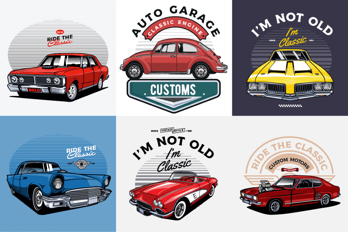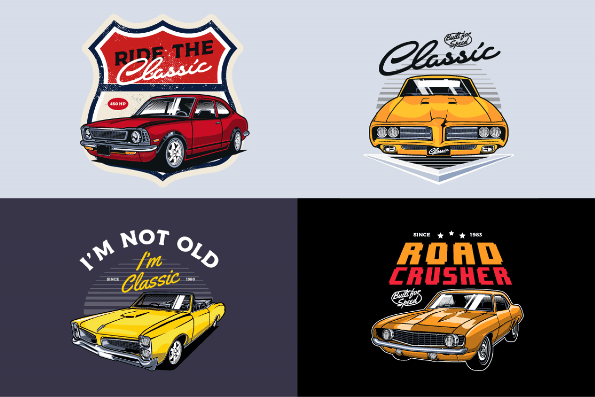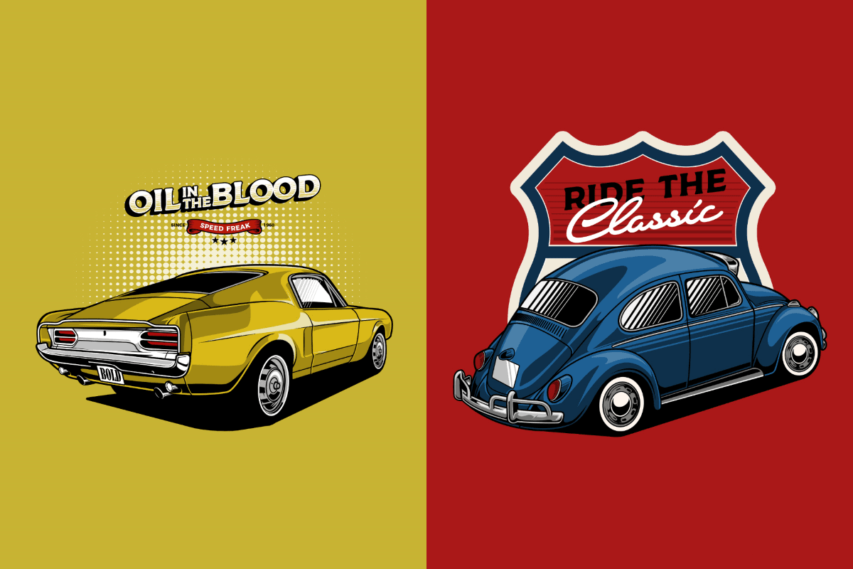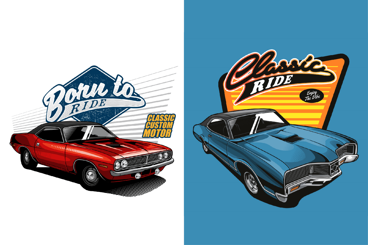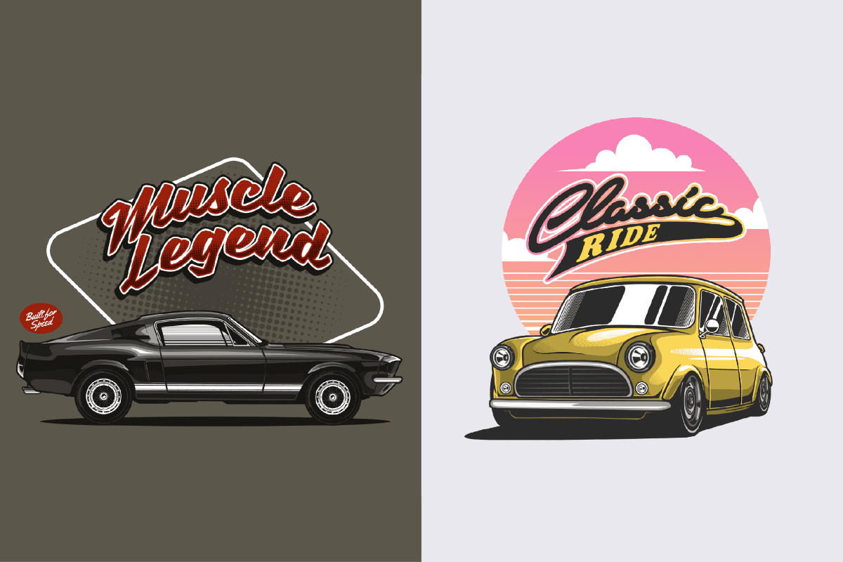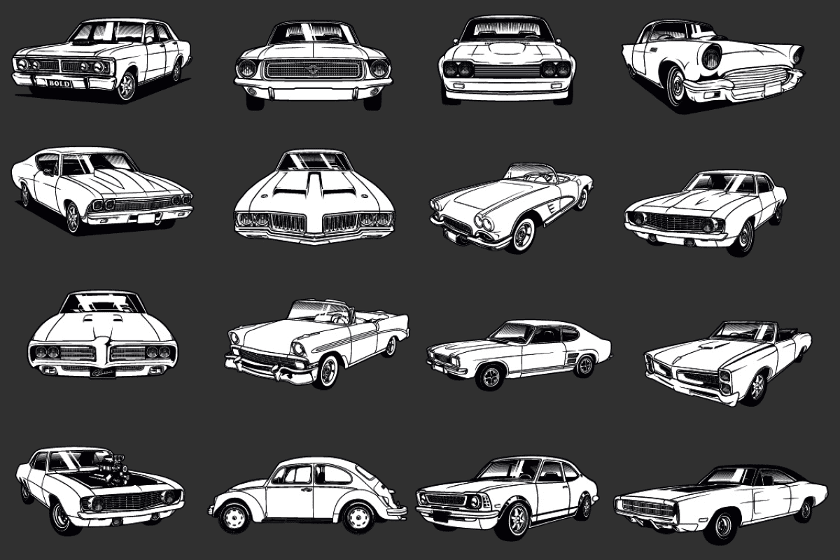 A big bundle of vector car illustrations with over 150 unique depictions of classic cars, american muscle cars, hotrods, japanese cars, offroad vehicles & trucks delivered in 100% vector source files as well as print ready raster files that you can use on for your digital designs and print projects – create t-shirt designs, posters, flyers, branding, logos and more using these awesome designs!