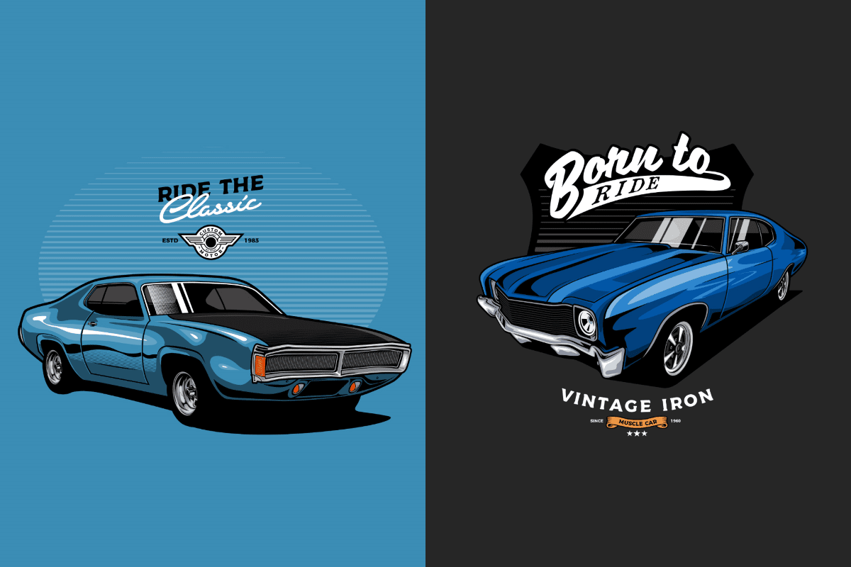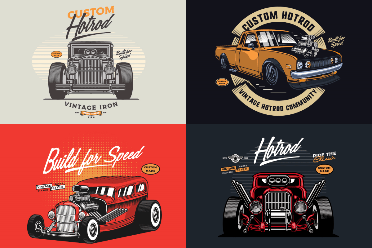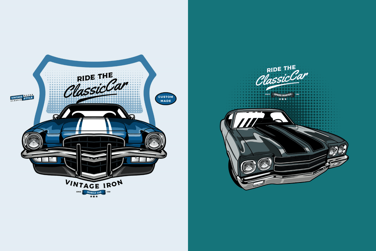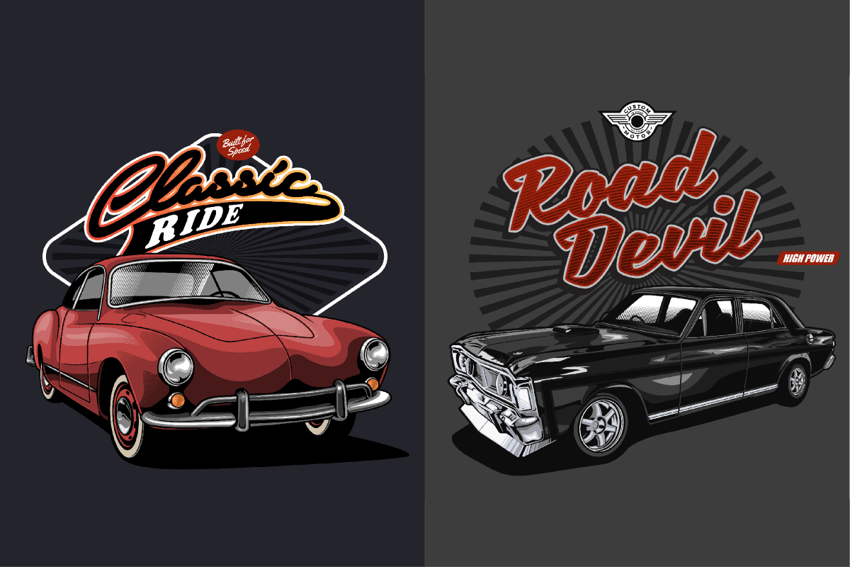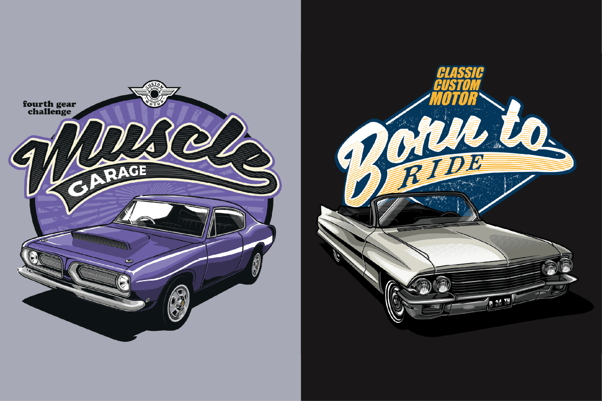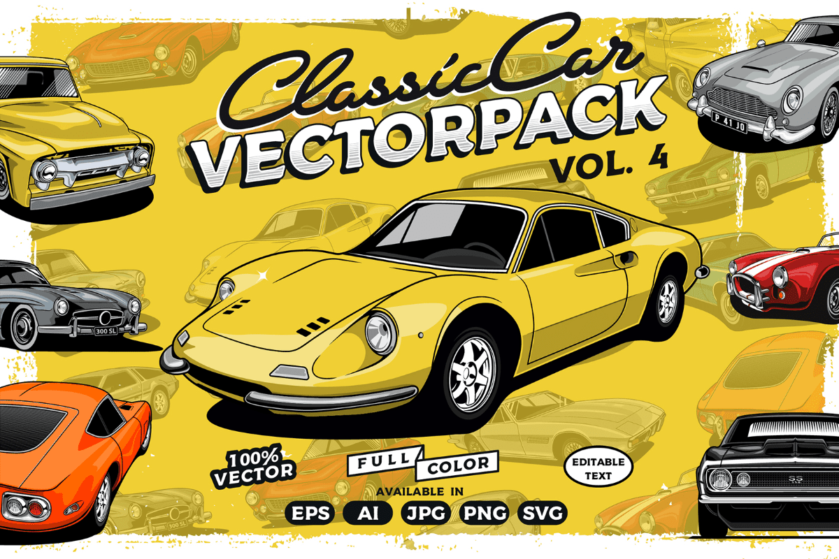 A big bundle of vector car illustrations with over 150 unique depictions of classic cars, american muscle cars, hotrods, japanese cars, offroad vehicles & trucks delivered in 100% vector source files as well as print ready raster files that you can use on for your digital designs and print projects – create t-shirt designs, posters, flyers, branding, logos and more using these awesome designs!