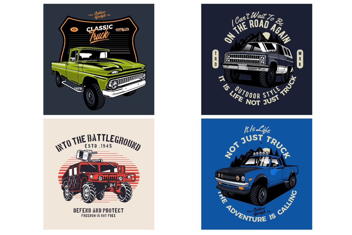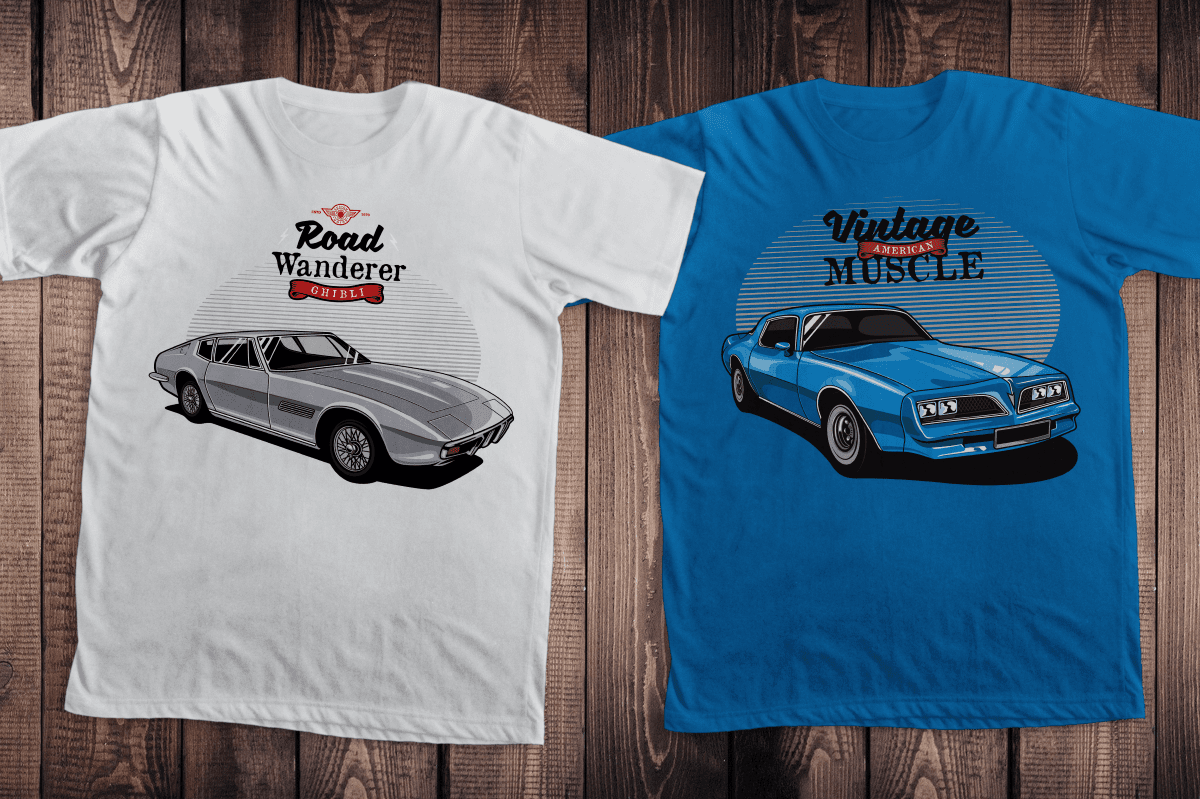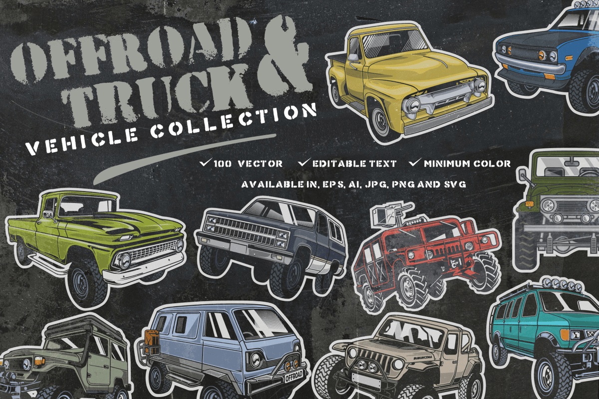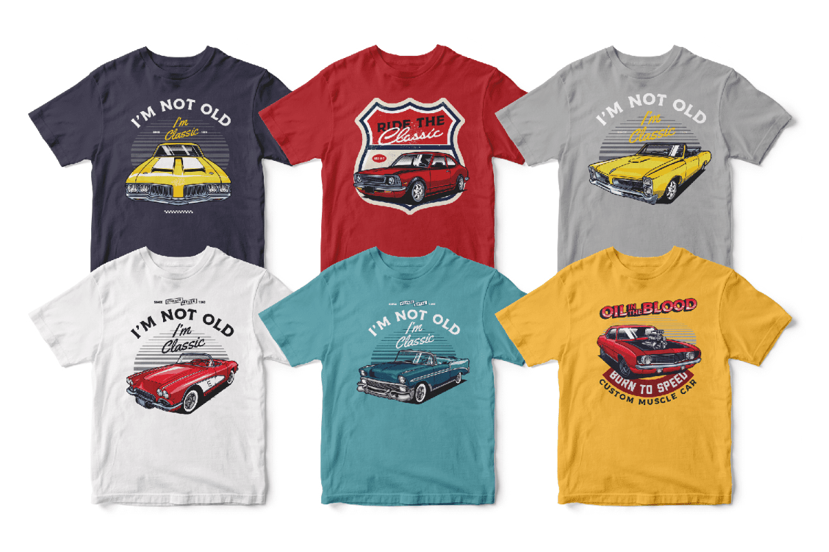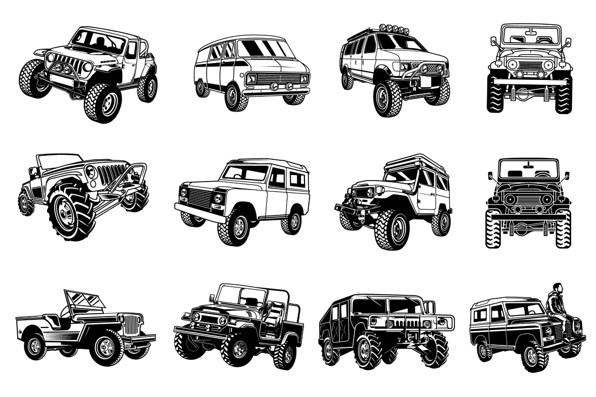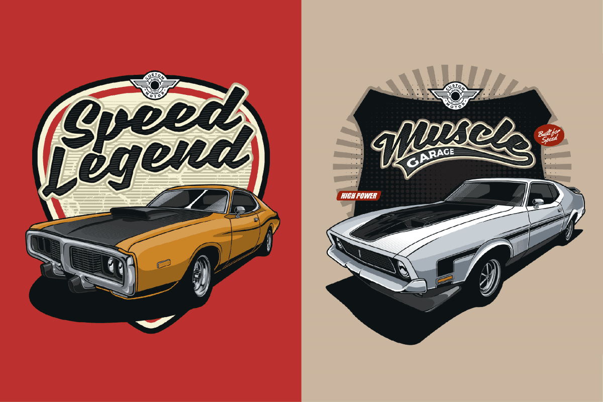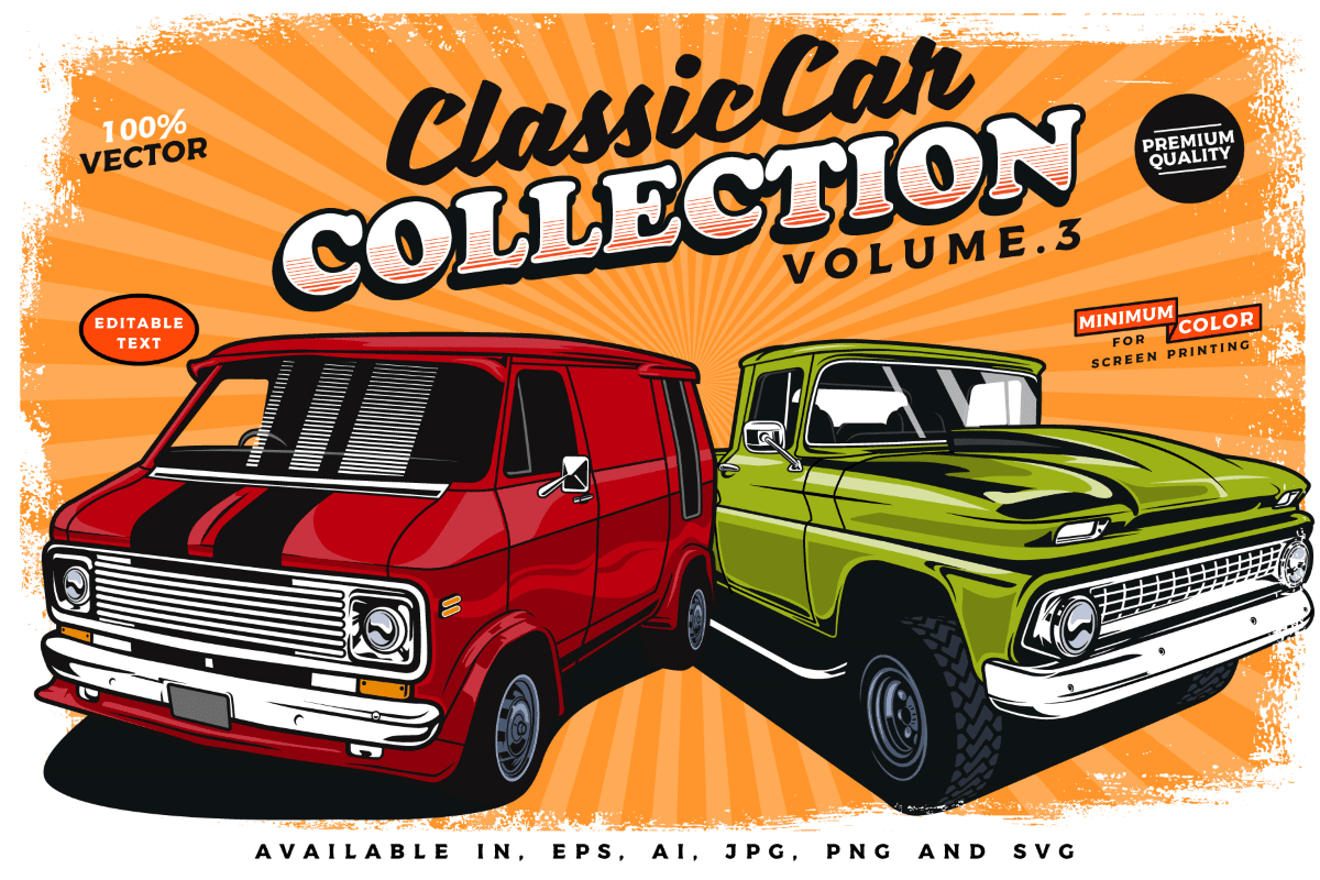 A big bundle of vector car illustrations with over 150 unique depictions of classic cars, american muscle cars, hotrods, japanese cars, offroad vehicles & trucks delivered in 100% vector source files as well as print ready raster files that you can use on for your digital designs and print projects – create t-shirt designs, posters, flyers, branding, logos and more using these awesome designs!